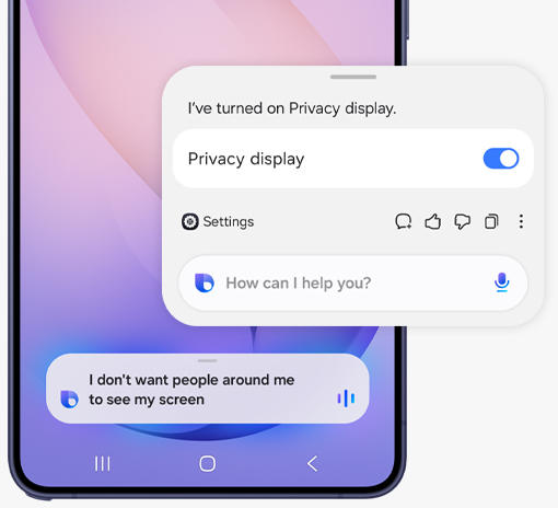 A világ első telefonba beépített betekintésgátló kijelzőjeIsmerd meg a beépített betekintésgátló kijelzőt, amely csak a Galaxy S26 Ultra készüléken érhető el! Csak manuálisan be kell kapcsolnod, és a betekintésgátló kijelző innovatív technológiát használva máris megvédi a személyes adataidat azáltal, hogy mások elől elrejti a teljes képernyőt. Vagy kiválaszthatod, hogy mit szeretnél elrejteni, például bizonyos alkalmazásoknál az összes bejövő értesítést, vagy amikor PIN-kódokat és jelszavakat kell megadnod a Beállításokban, a Zárolási képernyőn vagy a Biztonságos mappában.